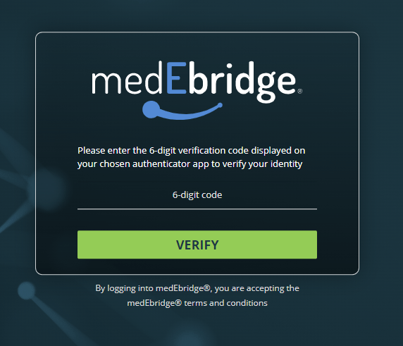 7) You will now be prompted to enter a code from the Authenticator App each time you access medEbridge®.